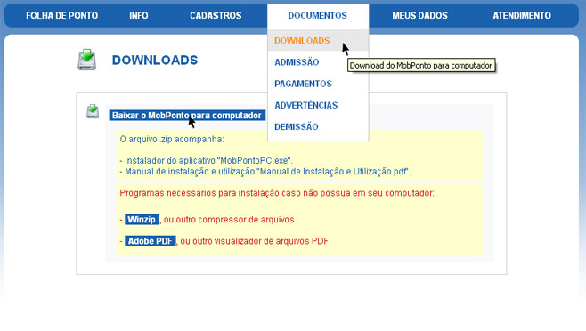 Para instalar o MobPonto no computador, acesse a sua conta em nosso site www.mobponto.com.br.
